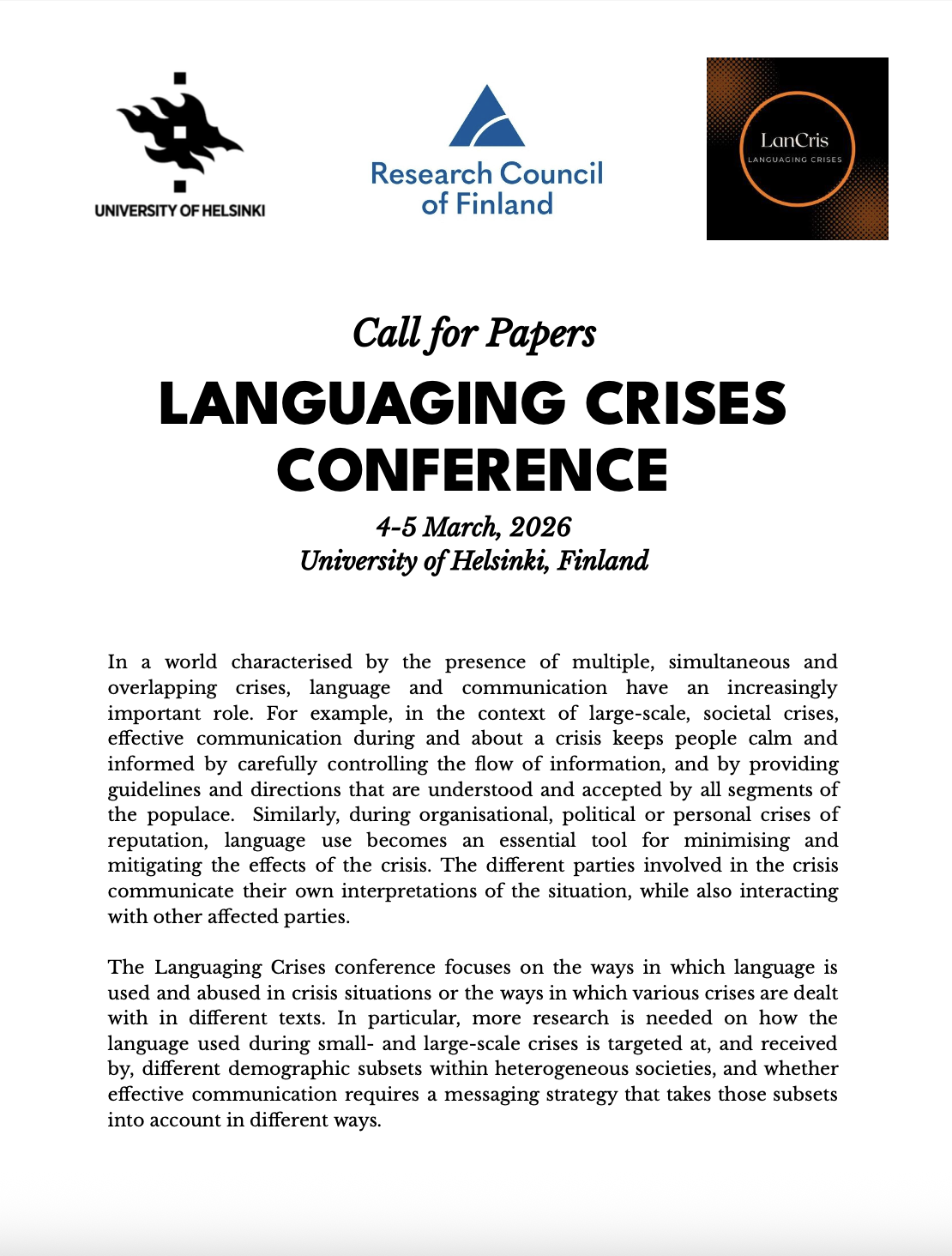 The Languaging Crises conference focuses on the ways in which language is used and abused in crisis situations or the ways in which various crises are dealt with in different texts. In particular, more research is needed on how the language used during small- and large-scale crises is targeted at, and received by, different demographic subsets within heterogeneous societies, and whether effective communication requires a messaging strategy that takes those subsets into account in different ways.