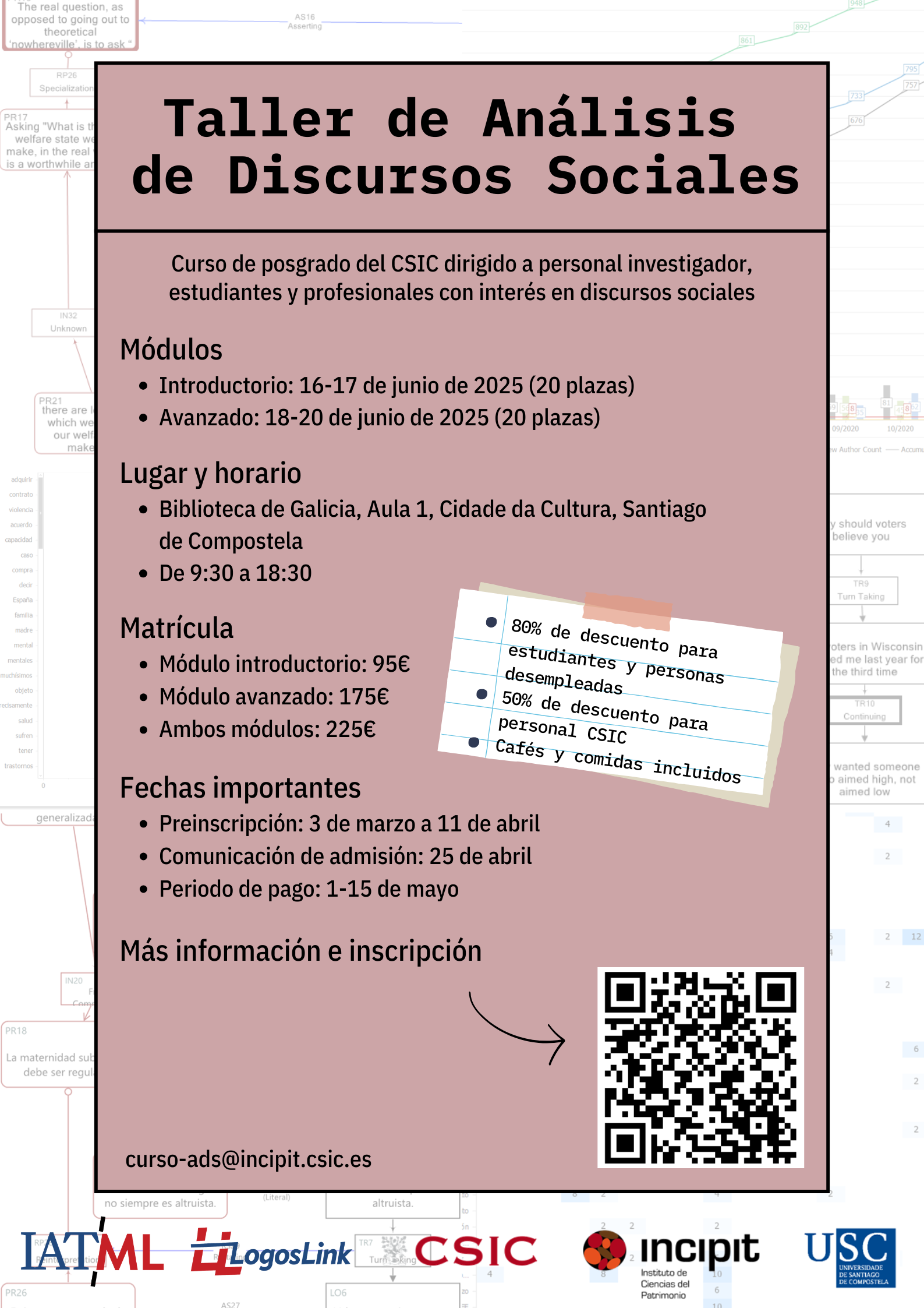 El Taller de Análisis de Discursos Sociales 2025 es un curso de posgrado oficial del Consejo Superior de Investigaciones Científicas (CSIC), organizado e impartido por investigadores del Instituto de Ciencias del Patrimonio (Incipit) en formato intensivo presencial. Este taller continúa la tradición formativa del grupo que, desde 2023, ha realizado diversas actividades de formación sobre análisis del discurso.