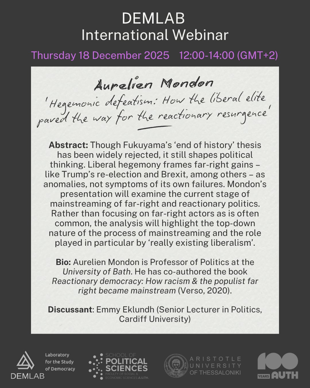 The second session of the new DemLab Webinar Series will be held on 18 December 2025 at 12:00 (GMT+2). We are pleased to welcome Aurelien Mondon from the University of Bath, who will present his research on “Hegemonic defeatism: How the liberal elite paved the way for the reactionary resurgence”.