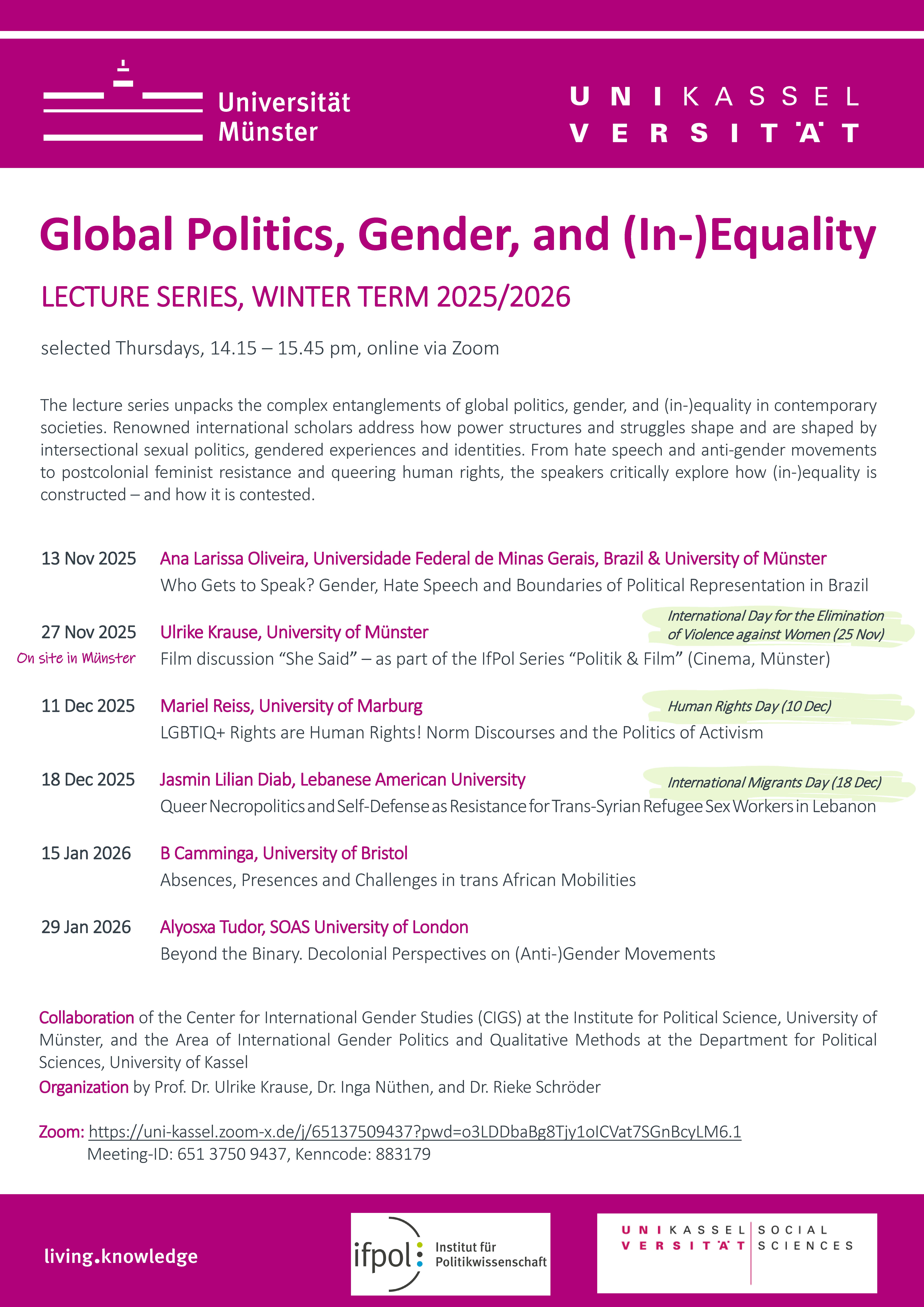 We are truly delighted and grateful that you will be part of our lecture series “Global Politics, Gender, and (In-)Equality” this winter term. Thank you so much for taking the time to contribute your expertise and insights – we very much look forward to your presentations and the discussions.