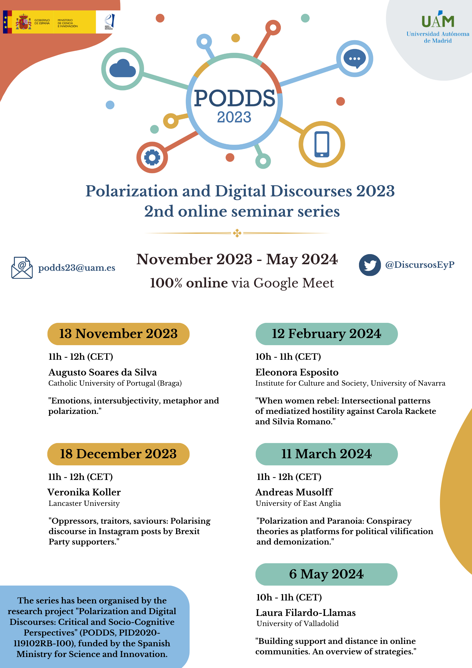 The research project “Polarization and Digital Discourses: Critical and Socio-Cognitive Perspectives” (PODDS) from University Autónoma of Madrid is organizing its second online seminar series, to be held between November 2023 and May 2024 via Google Meet.