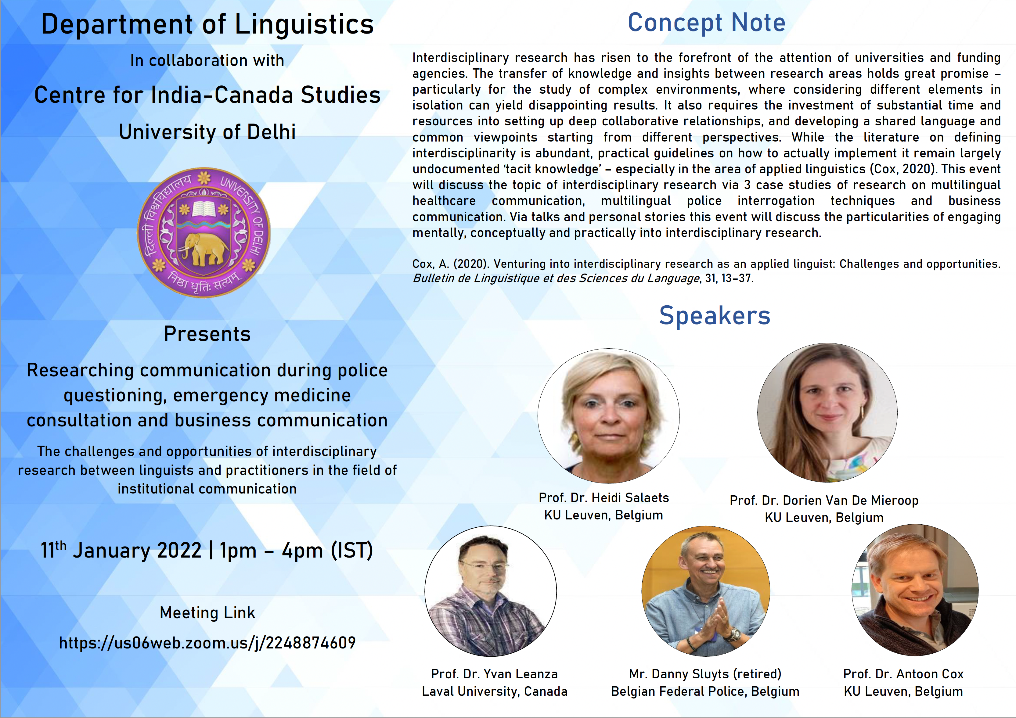 Interdisciplinary research has risen to the forefront of the attention of universities and funding agencies. The transfer of knowledge and insights between research areas holds great promise – particularly for the study of complex environments, where considering different elements in isolation can yield disappointing results. It also requires the investment of substantial time and resources into setting up deep collaborative relationships, and developing a shared language and common viewpoints starting from different perspectives. While the literature on defining interdisciplinarity is abundant, practical guidelines on how to actually implement it remain largely undocumented ‘tacit knowledge’ – especially in the area of applied linguistics (Cox, 2020). This event will discuss the topic of interdisciplinary research via 3 case studies of research on multilingual healthcare communication, multilingual police interrogation techniques and business communication. Via talks and personal stories this event will discuss the particularities of engaging mentally, conceptually and practically into interdisciplinary research.